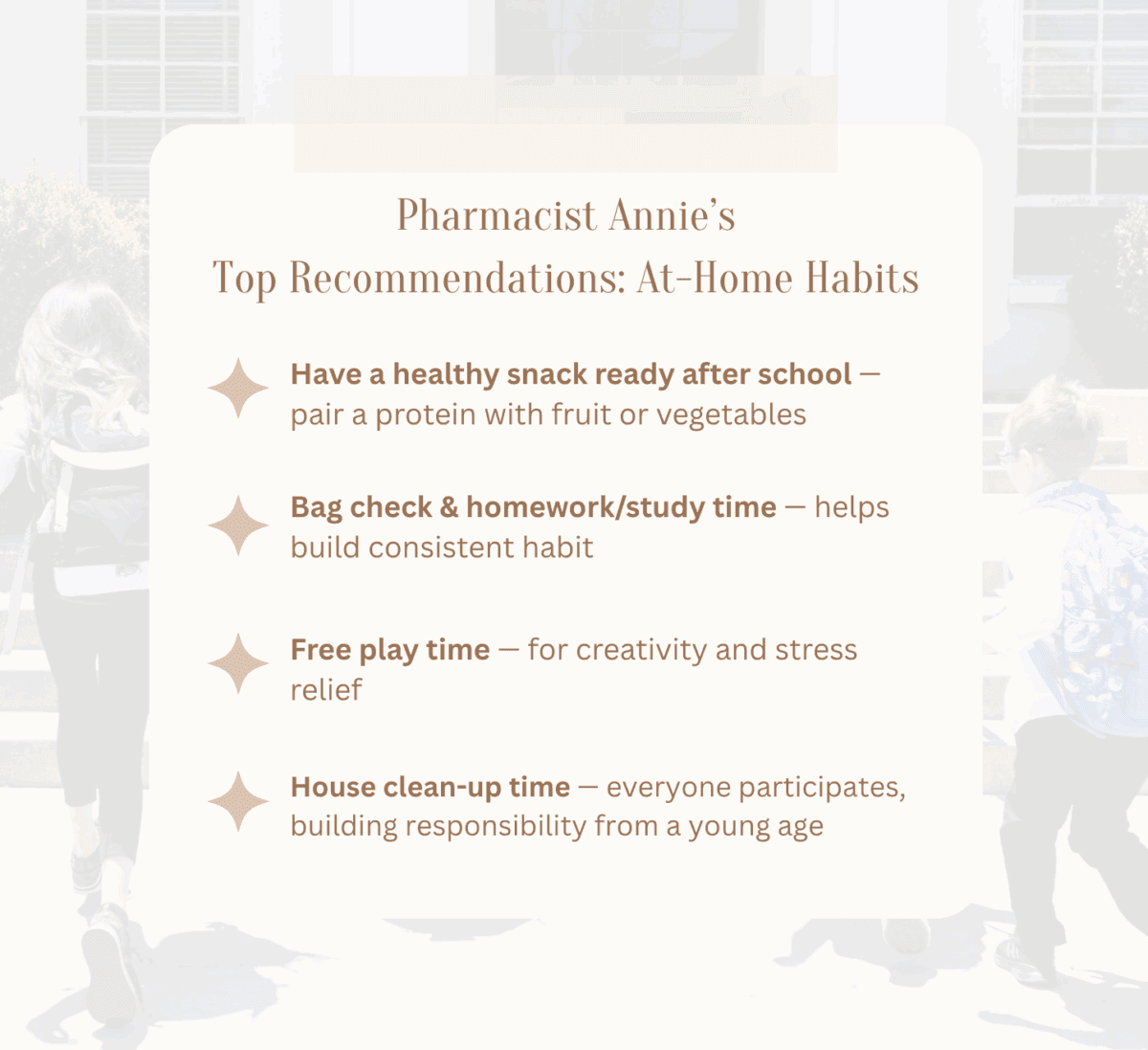 Pharmacist Annie shares her favorite at-home practices with her own kids, helping create a steady rhythm that supports focus, growth, and overall well-being for all ages.