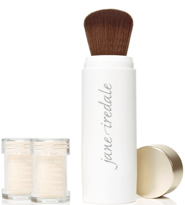 - Powder-Me SPF® by Jane Iredale — A weightless, dry sunscreen with broad-spectrum SPF—perfect for on-the-go touch ups