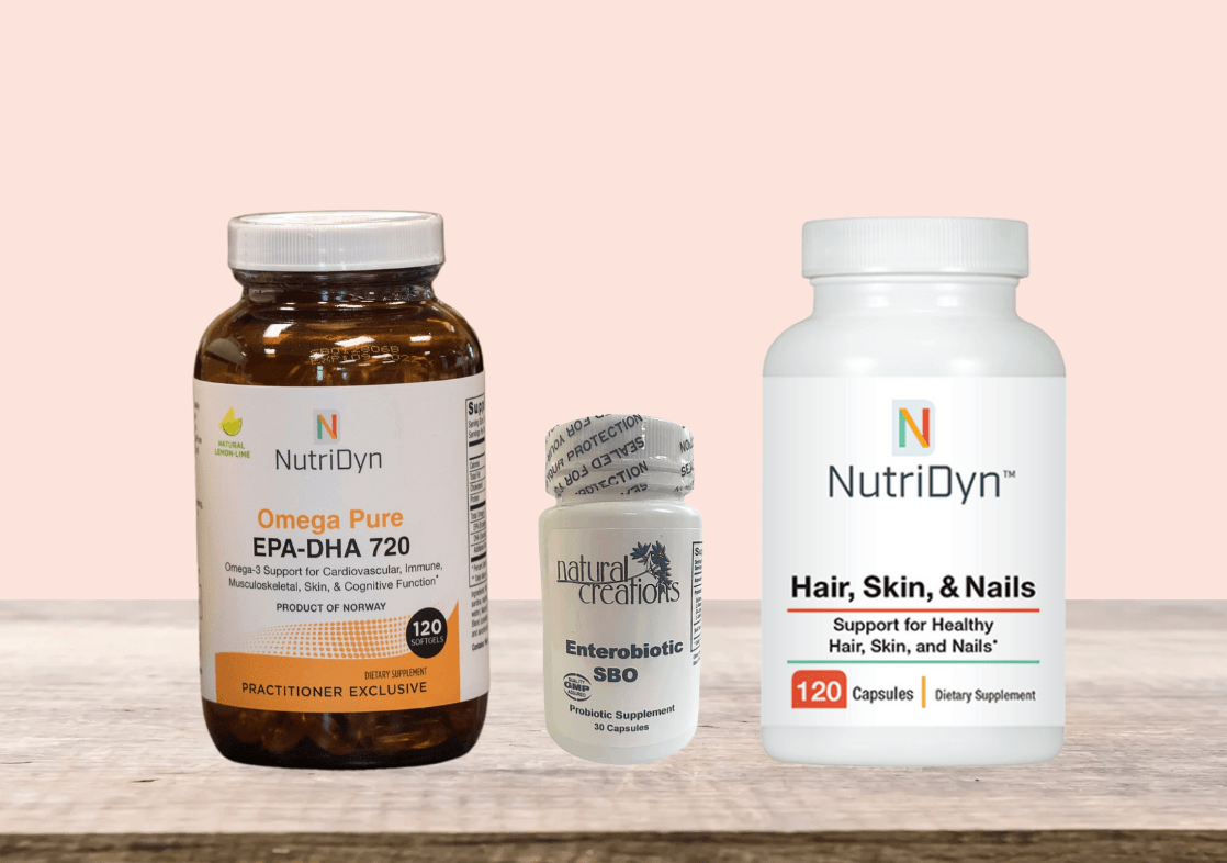 Hair, Skin, & Nails by NutriDyn: The ingredients in NutriDyn Hair, Skin, and Nails provide a multitude of beneficial effects, especially for nourishing cells contained in the skin and its related tissues, as well as supports antioxidant capacity in the skin. This updated blend also contains extra support for healthy hair, skin, and nails from increased vitamins, MSM, astaxanthin, and collagen. [Available in-store]